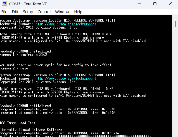 Turn on the router and make a connection with the serial port in Tera Term. In order to enter the ROMmon CLI, go to Control Send break (Alt + B).
